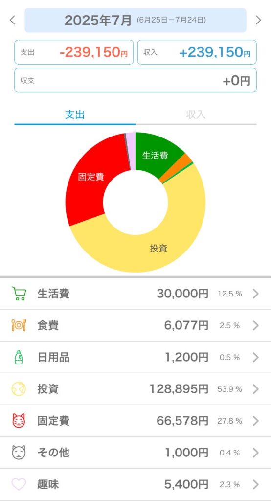 7月も投資に資金を優先配分した結果、支出の半分以上が投資関連に。